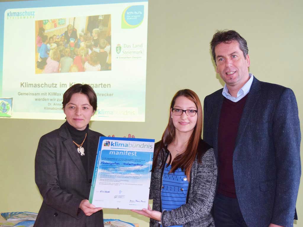 Warum Umwelterziehung schon im Kindergarten ebenso wie im sozialen Leben eine verantwortungsvolle Rolle spielen sollte und wie das Projekt im Kindergarten verlaufen ist, wurde im Rahmen eines Elterntreffens in der vergangenen Woche in Spielberg vorgestellt. Höhepunkt der Veranstaltung war die im Beisein von Bürgermeister Manfred Lenger an den Kindergarten verliehene Klimabündnisurkunde durch Anna Maria Maul vom Klimabündnis Steiermark.