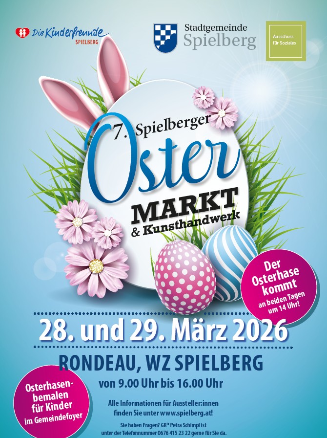 Am 28. und 29. März 2026 findet der bereits 7. Spielberger Ostermarkt im Rondeau des Wirtschaftzentrums Spielberg statt! Wir freuen uns wieder auf eine bunte Vielfalt an regionalen Aussteller:innen. Jetzt anmelden!