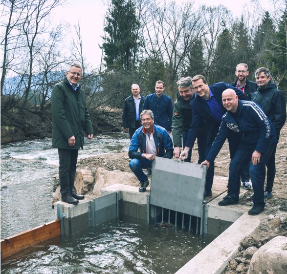 Am Freitag, dem 8. April 2022 war es soweit: Bürgermeister Manfred Lenger verkündete auf der Baustelle des Spielberger Pausendorfer Baches mit großer Freude das lang ersehnte „Wasser marsch“. Der Schieber des neu errichteten Ausleitungsbauwerks an der Mündung der Ingering und des Pausendorfer Baches wurde geöffnet. Die ausgeleiteten Wassermengen werden sich nun ihren Weg quer durch die Ortsteile Pausendorf und Maßweg bahnen, bis sie im Bereich Weyern schlussendlich in die schöne Mur fließen.