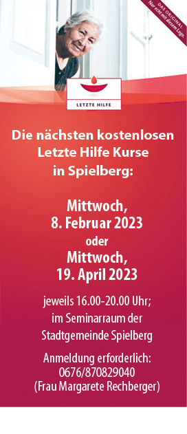 Im Herbst 2022 fanden in Spielberg die ersten beiden „Letzte Hilfe Kurse“ des Mobilen Palliativteams Murtal/Murau statt. Aufgrund des großen Interesses wurden für das Frühjahr 2023 bereits zwei weitere Termine in den Räumlichkeiten unserer Stadtgemeinde fixiert.