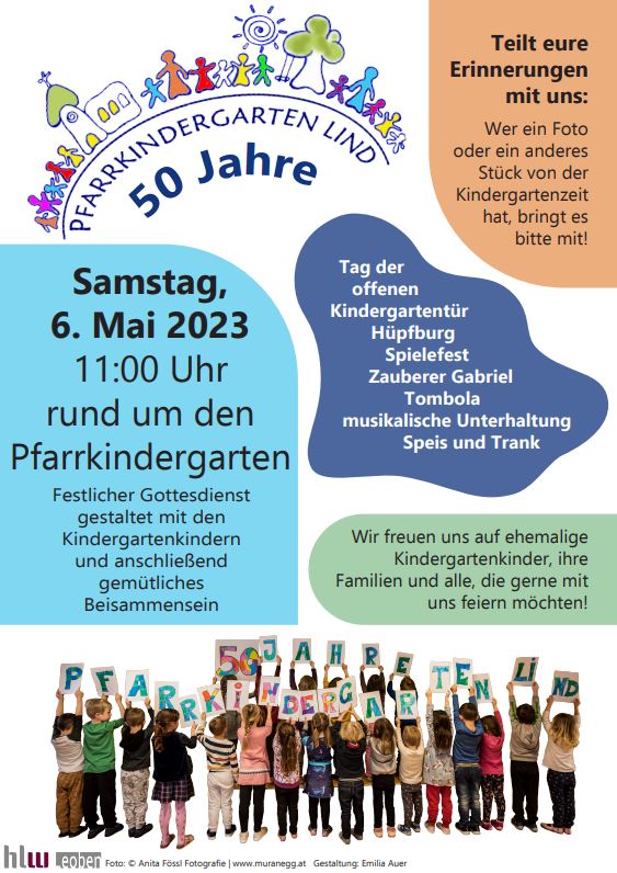 Der Pfarrkindergarten Lind lädt am Samstag, 6. Mai zur 50 Jahr-Feier! Wir gratulieren ganz herzlich zu diesem besonderen Jubiläum!