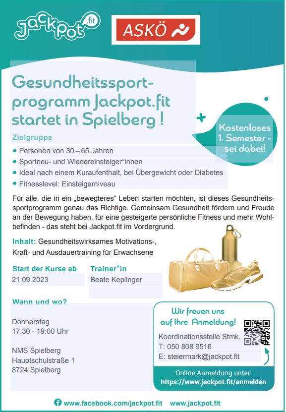 Sind Sie bereit den Jackpot für Ihre Gesundheit zu knacken? Das Gesundheitssportangebot „Jackpot.fit“ startet zu Semesterbeginn mit einem neuen Herbstkurs in Spielberg. Jackpot.fit Kurse richten sich an Sportneulinge oder Wiedereinsteigerinnen und Wiedereinsteiger im Alter von 30 bis 65 Jahren, die sich einen sanften Einstieg in ein gesünderes Leben wünschen.