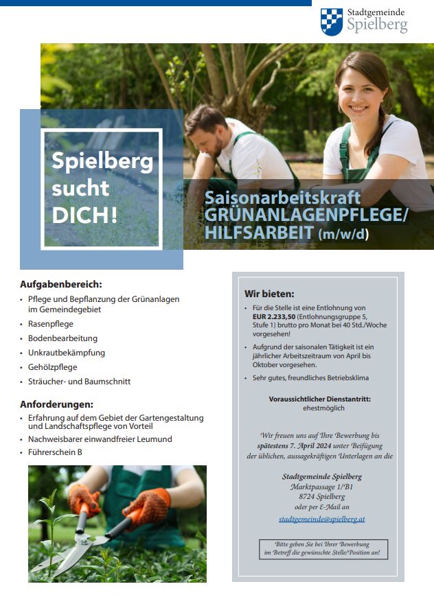 Spielberg sucht: Saisonarbeitskraft Grünanlagenpflege/ Hilfsarbeit (m/w/d
