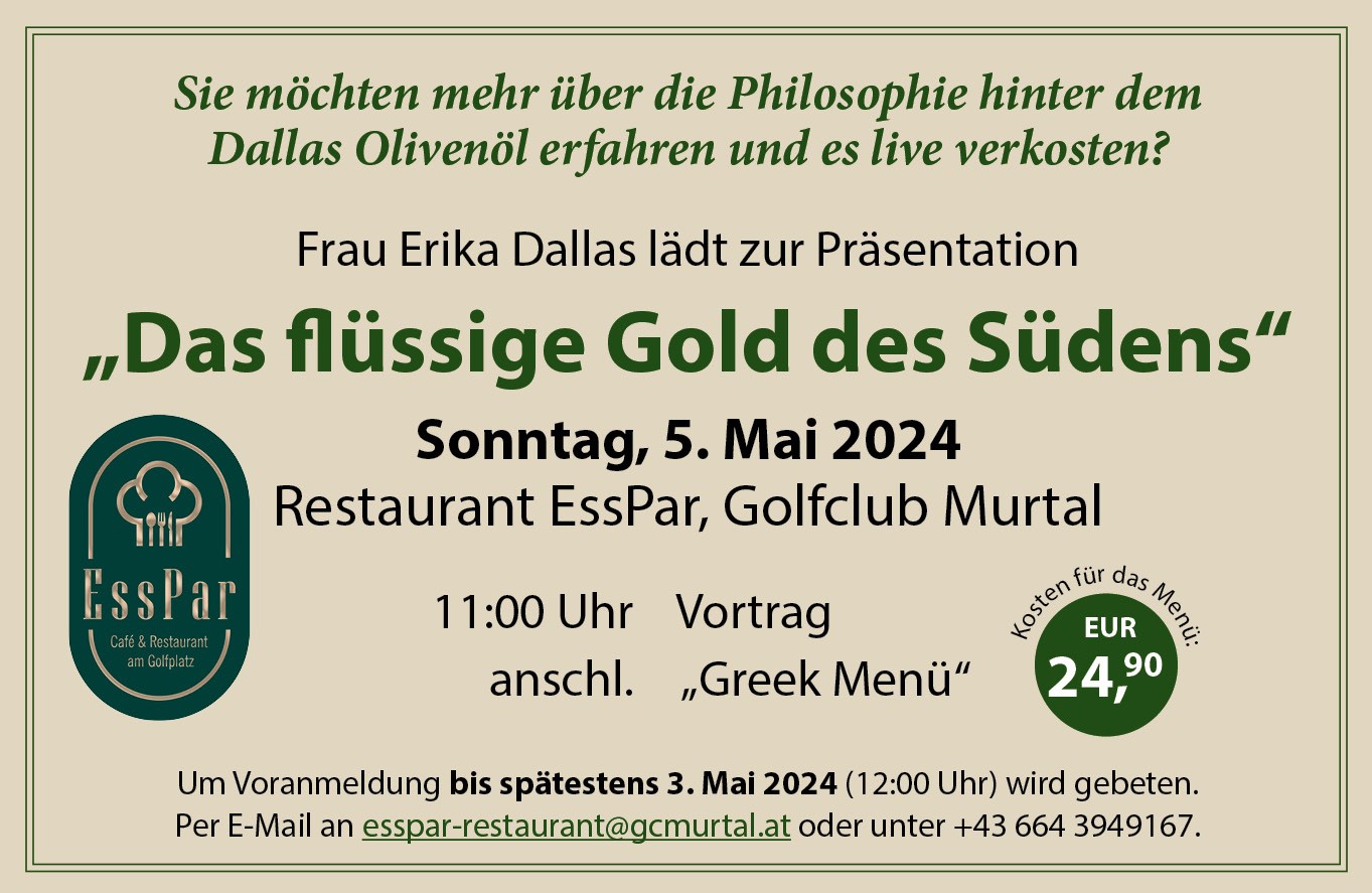 Frau Erika Dallas lädt zur Präsentation „Das flüssige Gold des Südens“ am Sonntag, 5. Mai 2024 Restaurant EssPar, Golfclub Murtal (um Voranmeldung wird gebeten).
