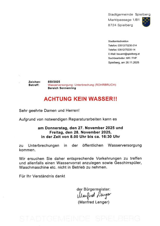 Aufgrund von notwendigen Reparaturarbeiten kann es am Donnerstag, den 27. November 2025 und Freitag, 28. November 2025, in der Zeit von 8.00 Uhr bis ca. 16.30 Uhr zu Unterbrechungen der öffentlichen Wasserversorgung im Bereich Sonnenring kommen. Wir bitten um Verständnis!